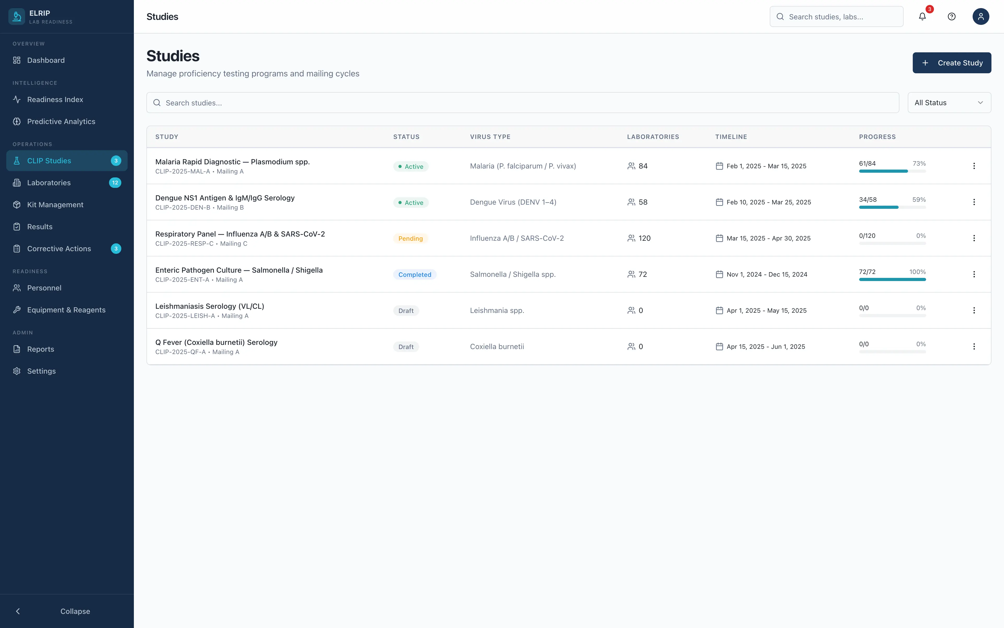 Easily create new proficiency studies, assign them to labs, and monitor participation and completion status in real time.