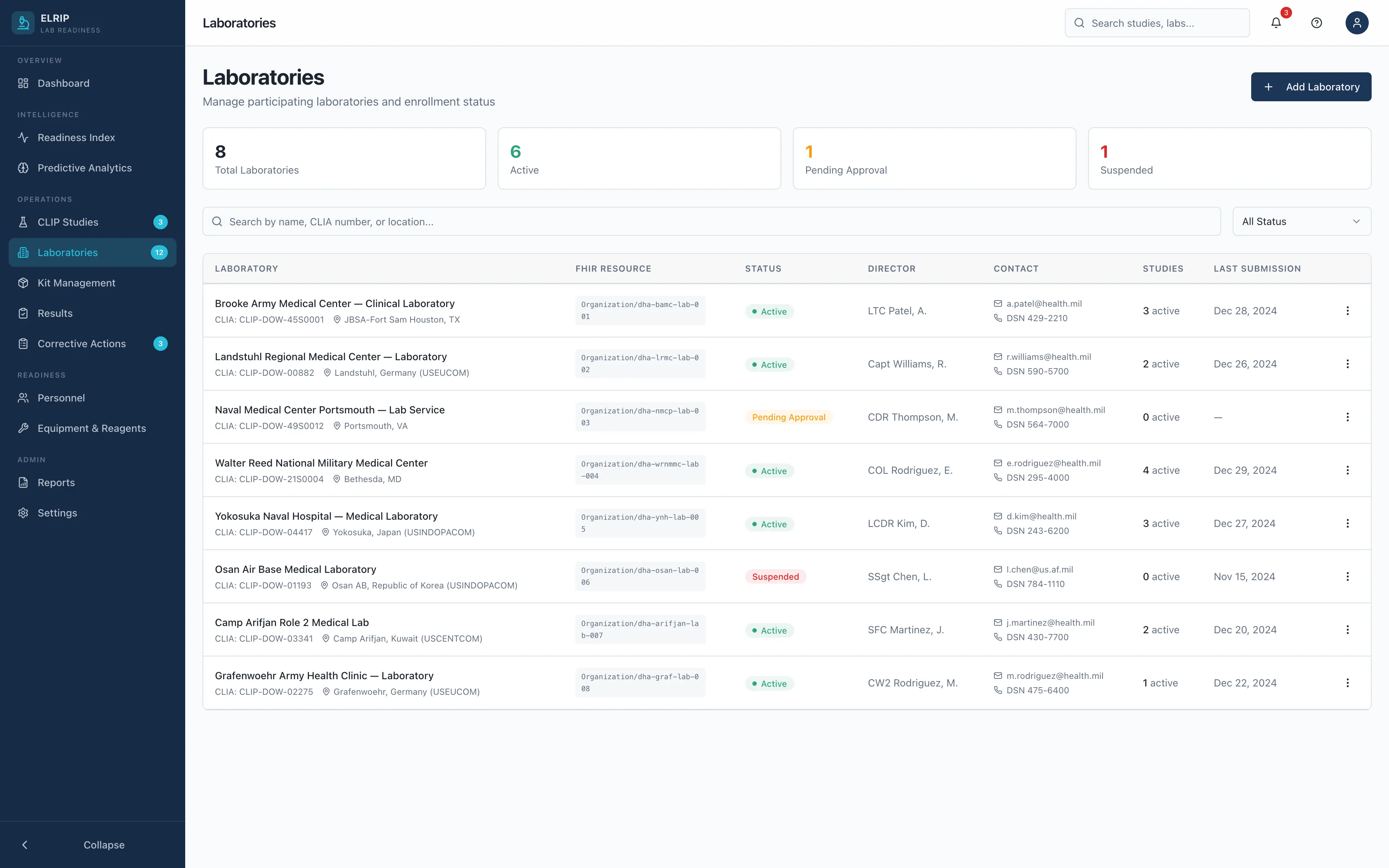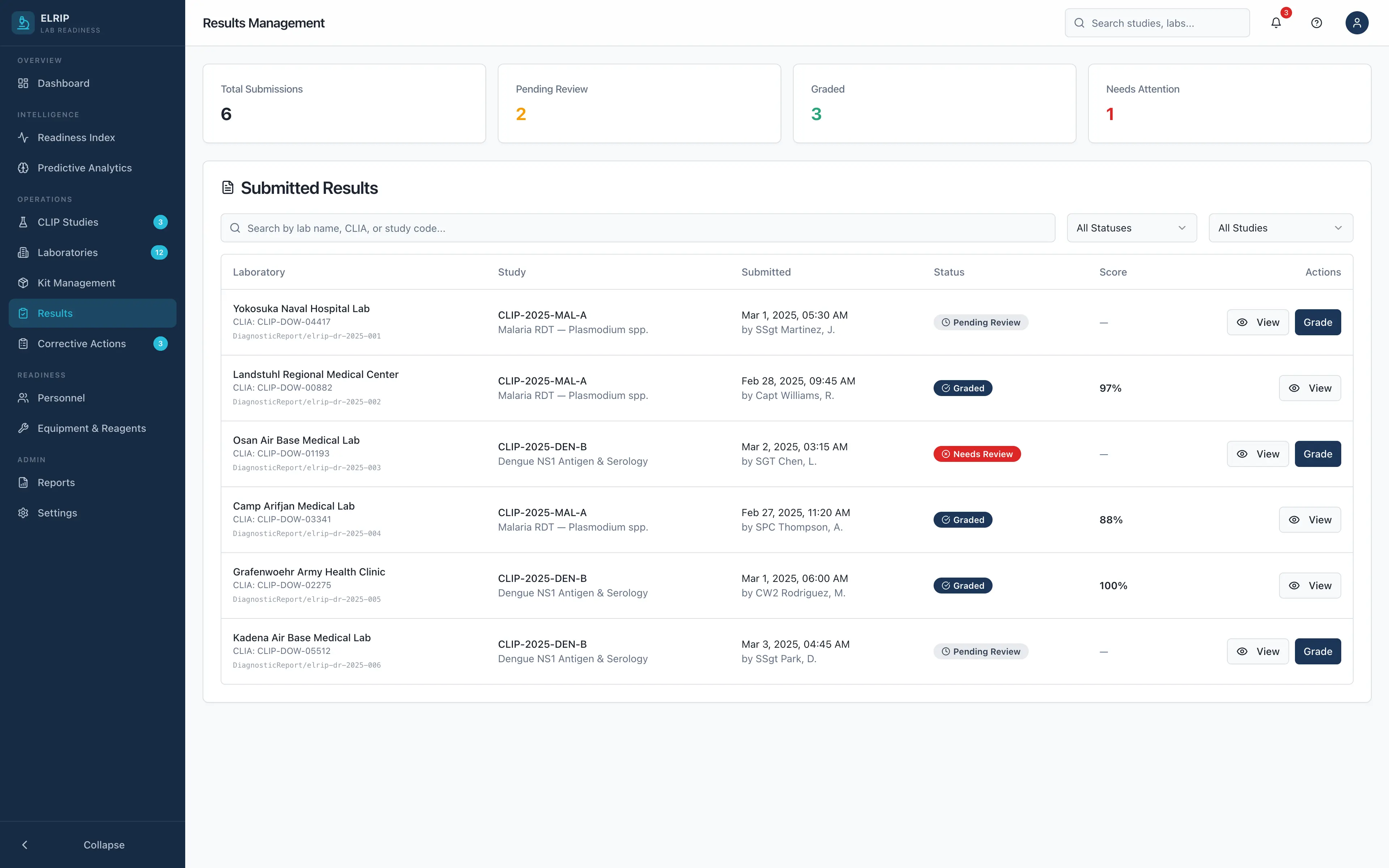 ELRIP transforms laboratory proficiency testing from compliance reporting to continuous operational readiness intelligence. Explore the command dashboard, admin panel and results management panel—purpose-built to manage studies, track performance, and deliver real-time analytics across every installation.